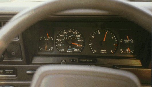 Erster Anlaufpunkt: mein Haus. Als ich auf den Garagenvorplatz fahre, lande ich fast in den Büschen. Diese Kiste hat unglaubliche 13 Meter Wendekreis. Der Senator hatte 10 Meter. Das gibt Probleme. Aber nur kleine. Also fahre ich auf die Bundesstraße, die ostwärts aus der Stadt hinausführt. Die Automatik schaltet wirklich kaum spürbar, eine Menge Power ist vorhanden. Straßenlage, Beschleunigung und Kurvenverhalten sind prima. Die wichtigsten Sachen sind elektrisch: Fenster vorne und hinten, beide Außenspiegel, die Einstellung des Fahrersitzes. Getönte Scheiben, Cassettenradio mit vier Lautsprechern, Lenkrad-Höhenverstellung, Halter für Cola-Dosen. Leider keine Klima-Anlage. Und kein ABS und kein Airbag, aber das habe ich damals wie heute auch nicht vermißt. Die Klima-Anlage hätte ich nachrüsten können, die Grundausstattung inklusive Verkabelung ist bereits vorhanden, aber irgendwie habe ich sie nicht so sehr vermißt, daß ich das Geld dafür rausgeworfen hätte. Bisher ging es ohne. Irgendwann fahre ich zum Händler zurück.